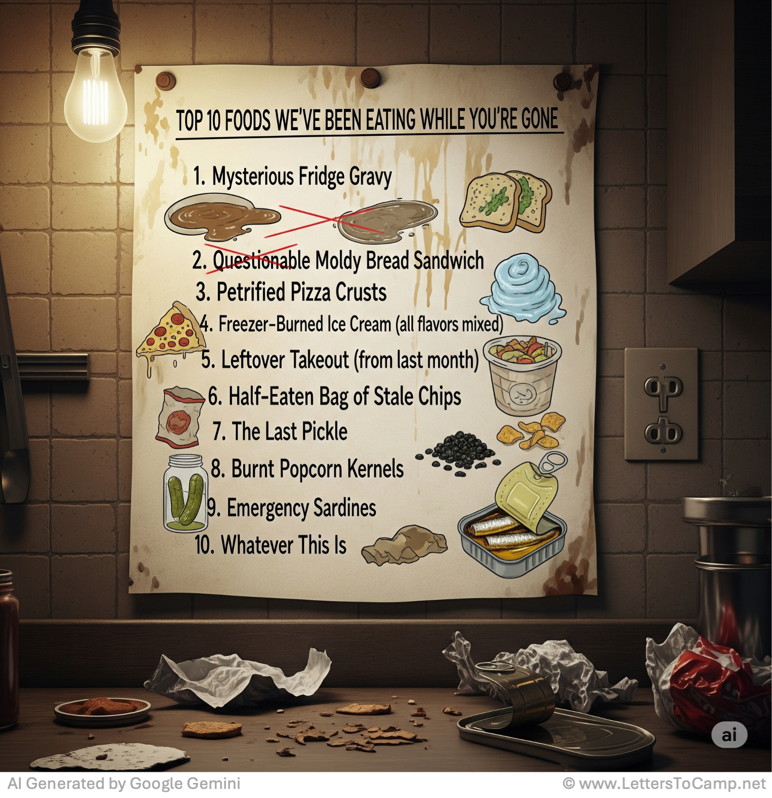 • Create a “Top 10” list Compile a humorous list, such as “Top 10 Foods We’ve Been Eating While You’re Gone” (include some truly unappetizing items), or “Top 10 Parent Activities While You’ve Been at Camp” (e.g., cleaning closets, organizing the garage). Source: Google AI search based on Gold Arrow Camp , Pali AdventuresCamp Walt WhitmanSunshine Parenting, and the Momling at the Well Trained Mind Community.