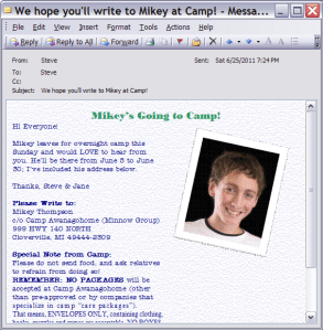 Continue reading ‘Write with Intention’Every year, my sisters send great emails to family and friends so that everyone knows when their respective kids will be at camp, where to write and what is acceptable to send.